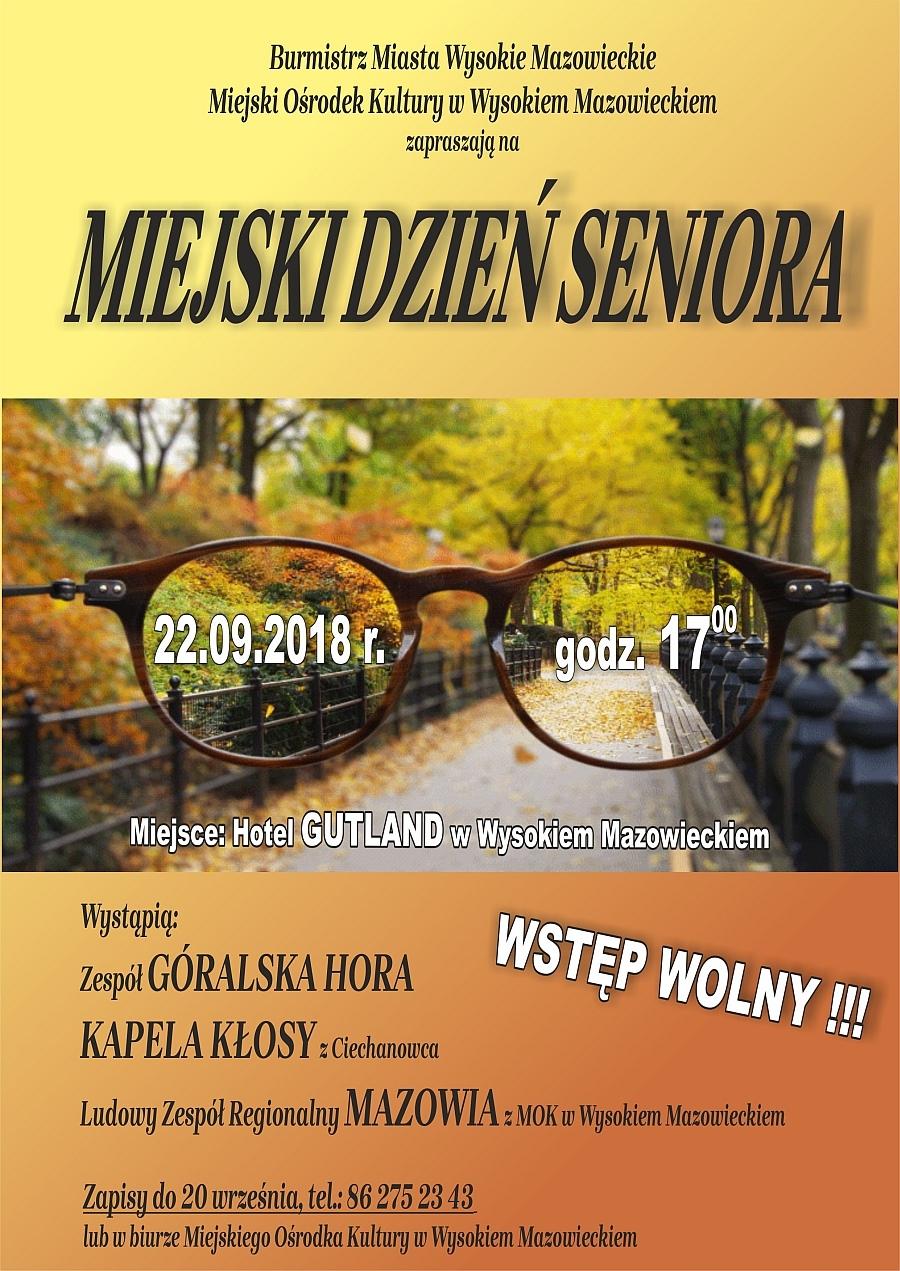 Burmistrz Miasta Wysokie Mazowieckie oraz Miejski Ośrodek Kultury w Wysokiem Mazowieckiem zapraszają na "MIEJSKI DZIEŃ SENIORA". Wydarzenie odbędzie się w sobotę, 22 września o godzinie 17.00 w Hotelu GUTLAND w Wysokiem Mazowieckiem.
