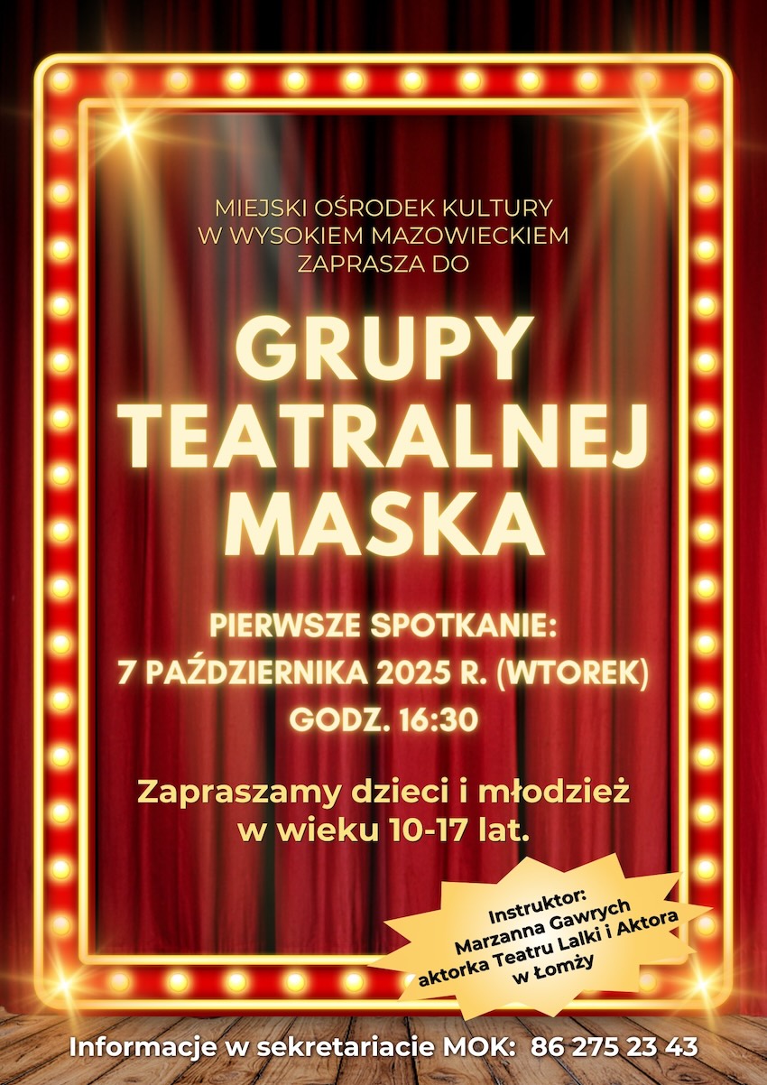 Miejski Ośrodek Kultury w Wysokiem Mazowieckiem otwiera nowy sezon artystyczny, zapraszając mieszkańców z pasją do teatru do dołączenia do działającej przy placówce grupy teatralnej "MASKA". To propozycja dla wszystkich, którzy chcą spróbować swoich sił na scenie, rozwinąć swoje umiejętności aktorskie i stać się częścią lokalnej społeczności artystycznej.
