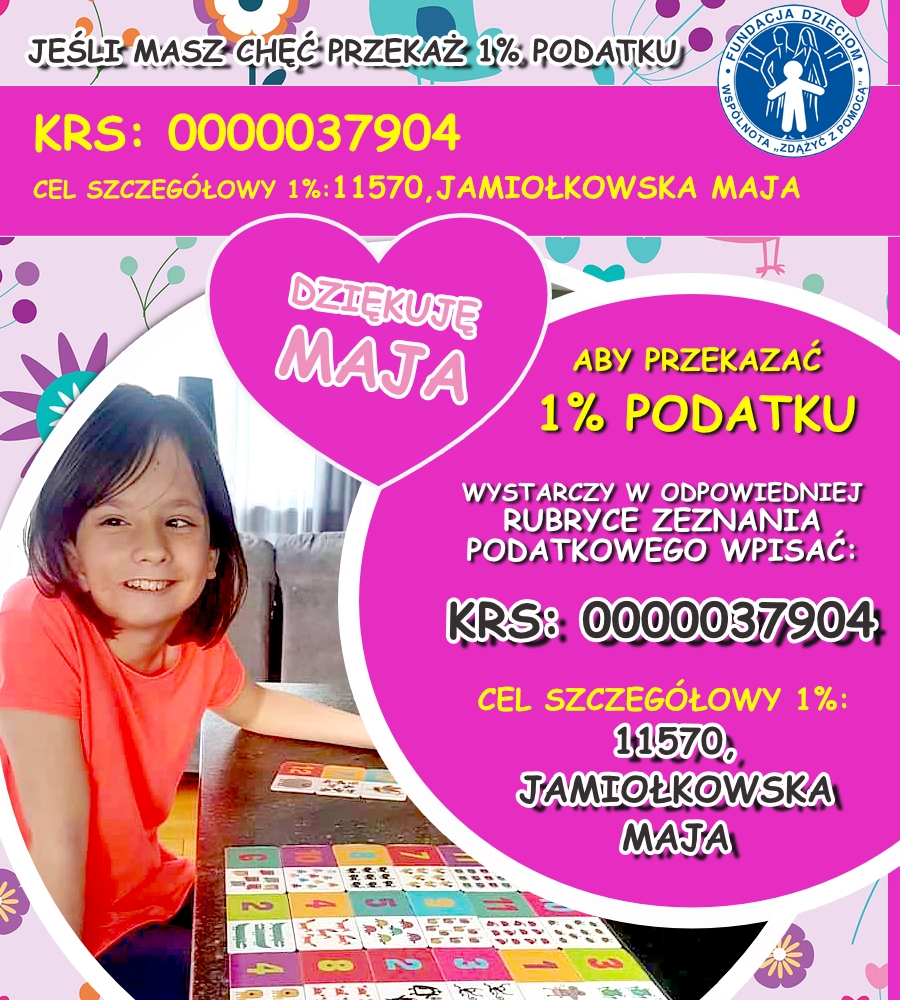 W imieniu naszym oraz naszej córeczki składamy podziękowanie tym wszystkim, którzy zdecydowali się przekazać swój 1% podatku na rzecz Mai.