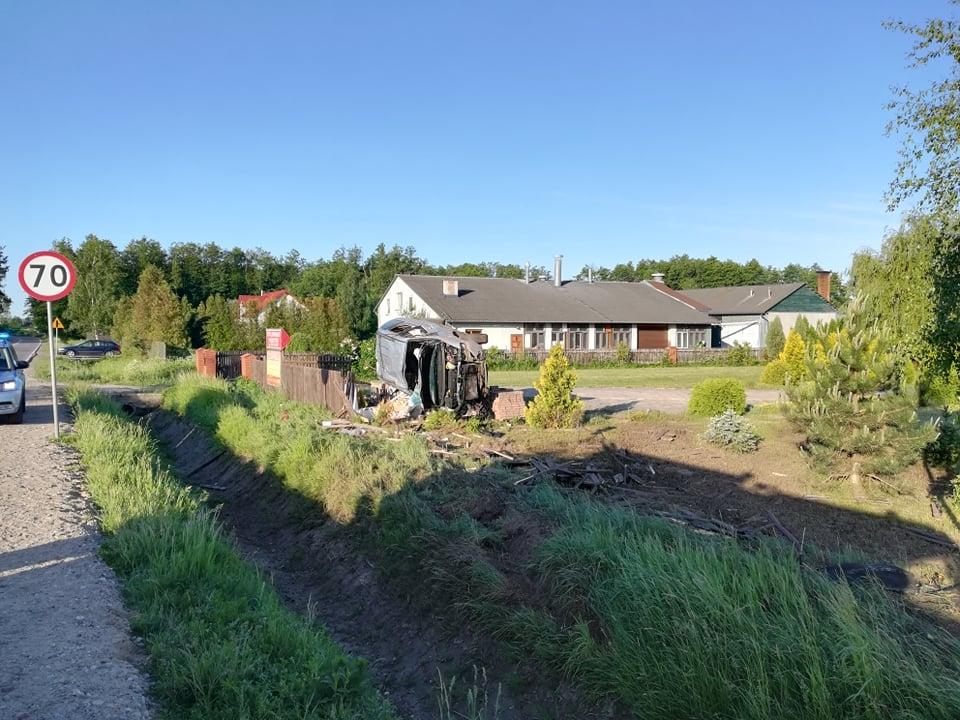Osobowy chrysler wypadł z drogi i uderzył w ogrodzenie jednej z posesji w okolicy miejscowości Plewki. Dwie osoby zostały zabrane do szpitala.