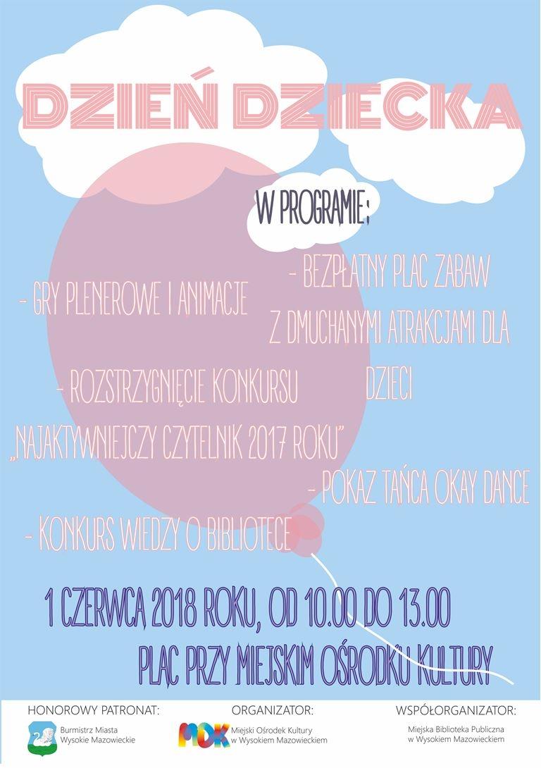 Miejski Ośrodek Kultury w Wysokiem Mazowieckiem oraz Miejska Biblioteka Publiczna zapraszają na spotkanie z okazji Dnia Dziecka, które odbędzie się 1 czerwca 2018 roku w godzinach od 10:00 do 13:00, na placu przy MOK.