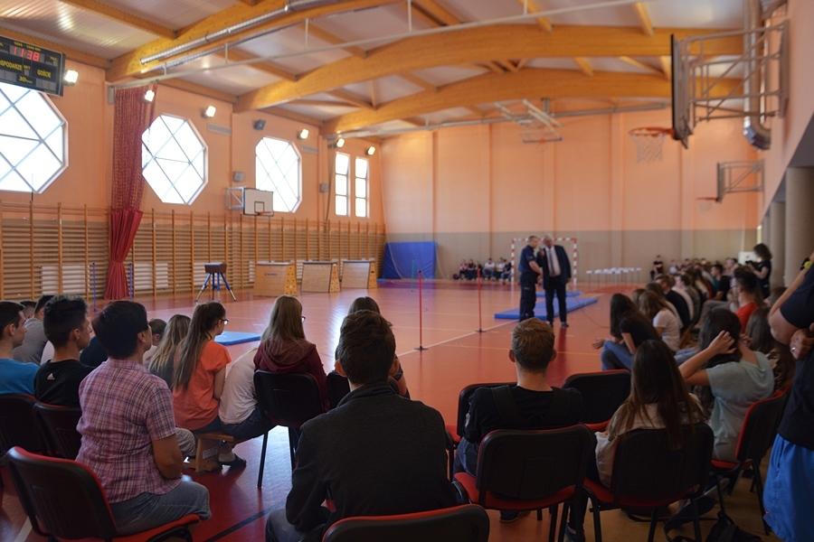 W miniony piątek na sali gimnastycznej Zespołu Szkół Ogólnokształcących i Policealnych w Wysokiem Mazowieckiem wysokomazowieccy policjanci demonstrowali prawidłowe pokonanie toru przeszkód, który jest jednym z elementów postępowania kwalifikacyjnego do służby w Policji.