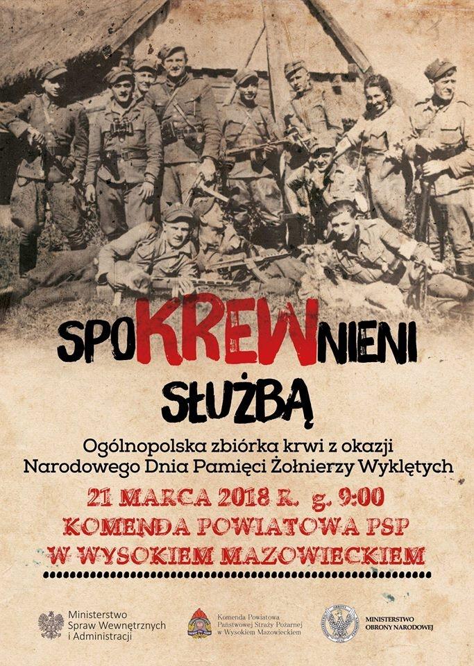 Przez cały marzec strażacy z PSP i OSP województwa podlaskiego zaangażowani są w akcję honorowego krwiodawstwa pod hasłem „SpoKREWnieni służbą”. Przedsięwzięcie, organizowana wspólnie z Policją i Strażą Graniczną, zostało zainaugurowane 1 marca w Narodowym Dniu Pamięci Żołnierzy Wyklętych.