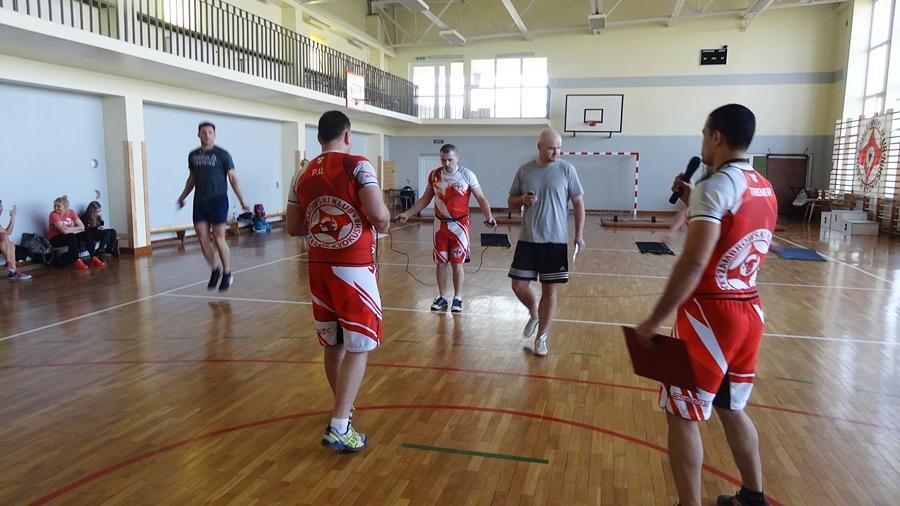 - WOD I przedstawiał się następująco: 10 razy rwanie i podrzut sztangi 15 kg , 30 razy scyzoryki na brzuch, 15 razy pompki z zmianą strony, 100 razy przeskoki przez skakankę, 20 razy burpees (padnij powstań) cały obwód powtarzany 2 razy.