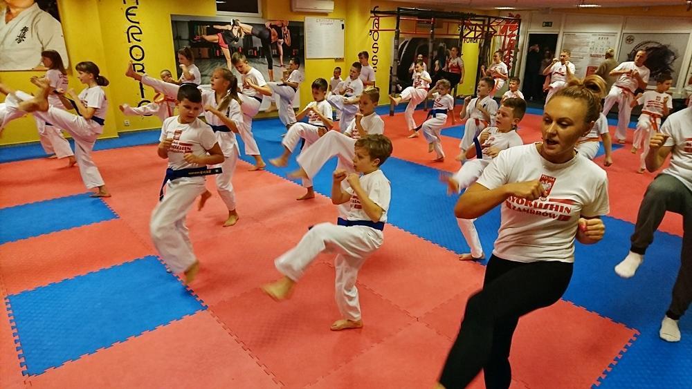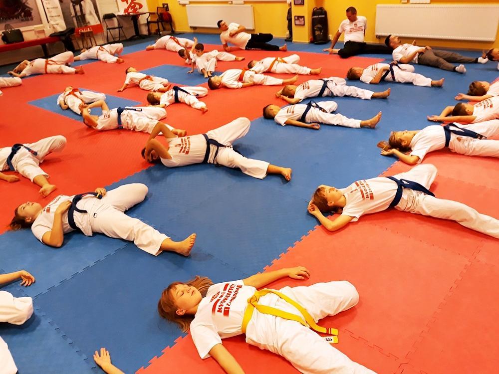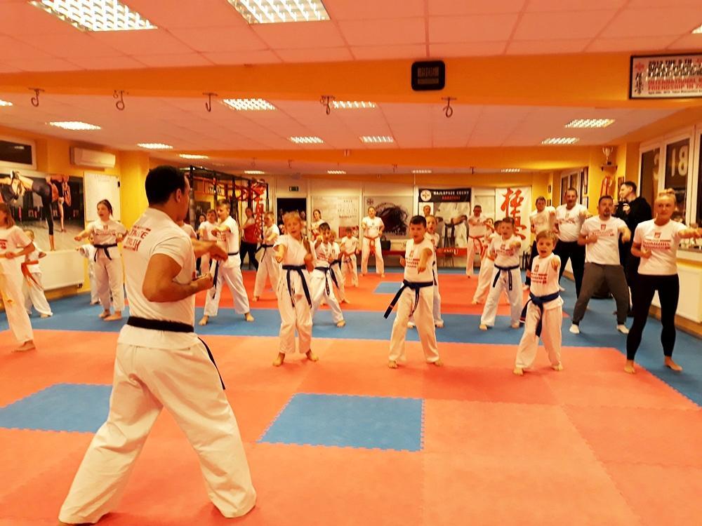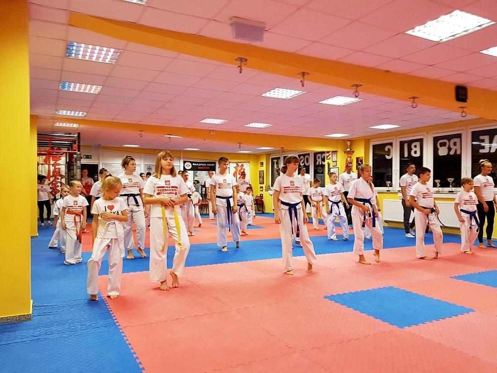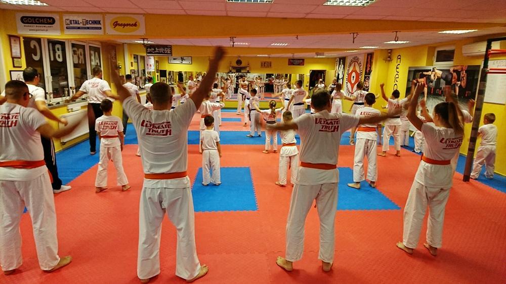 Trening rozpoczął się od wysłuchania hymnu Polski, następnie krótka rozgrzewka i wspólne sto kopnięć i uderzeń. W treningu uczestniczyli również rodzice karateków.