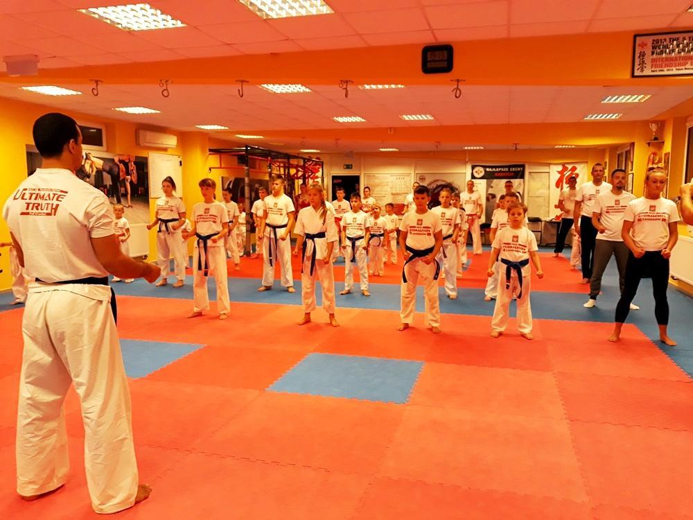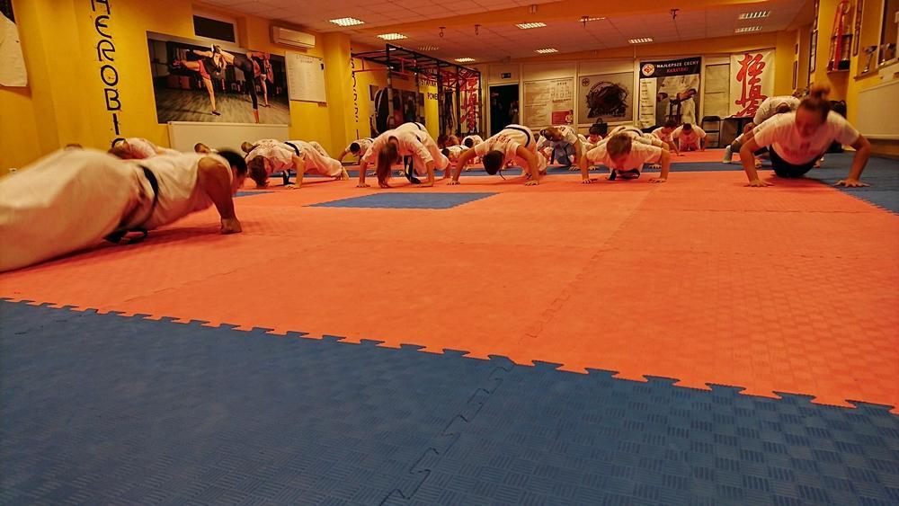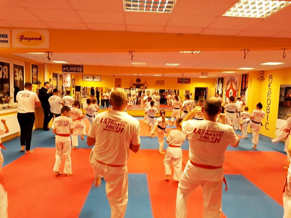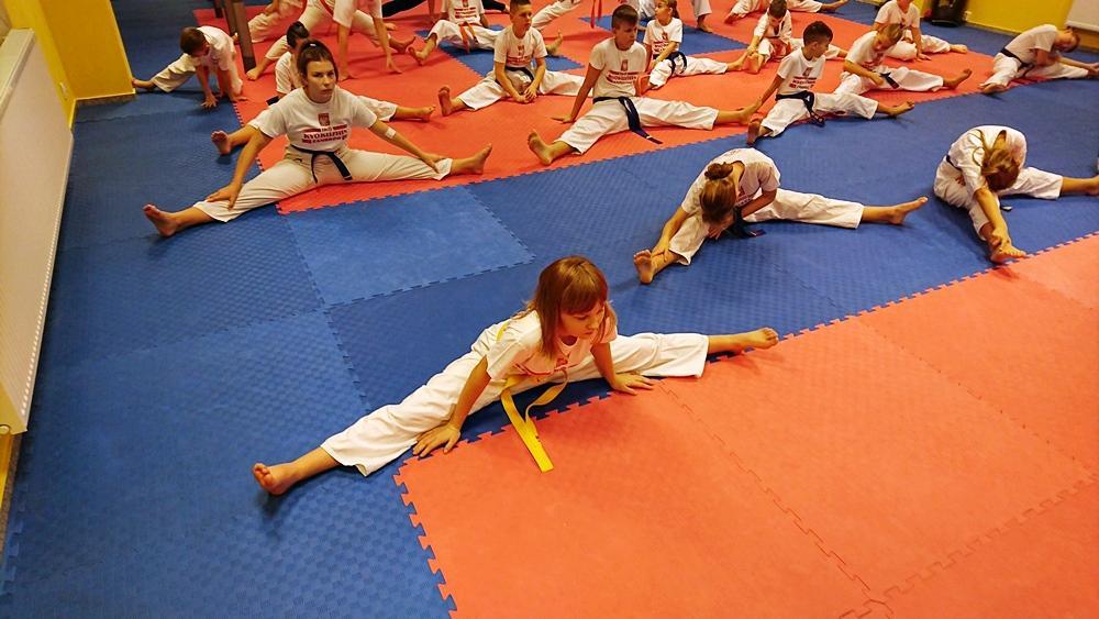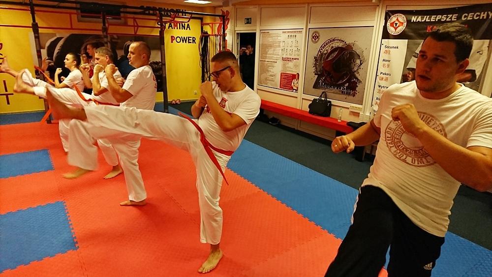 Trening rozpoczął się od wysłuchania hymnu Polski, następnie krótka rozgrzewka i wspólne sto kopnięć i uderzeń. W treningu uczestniczyli również rodzice karateków.