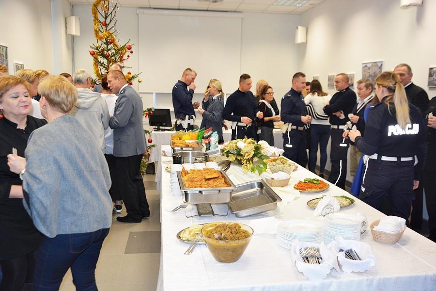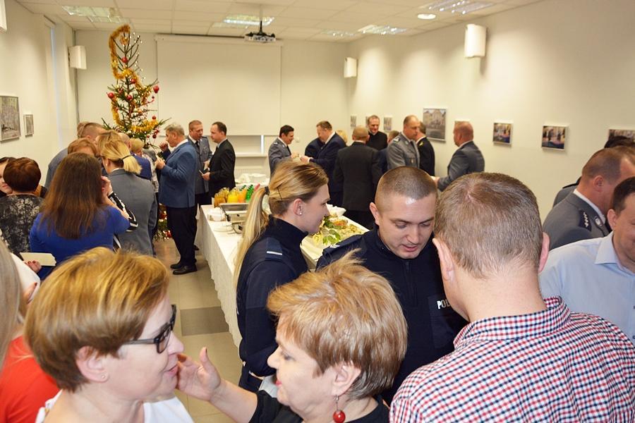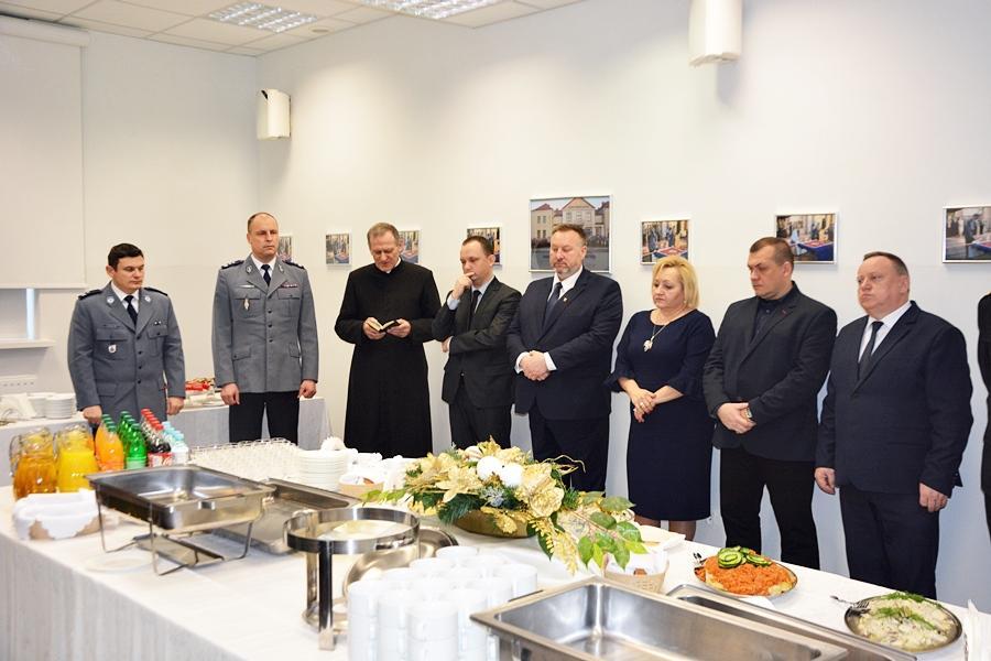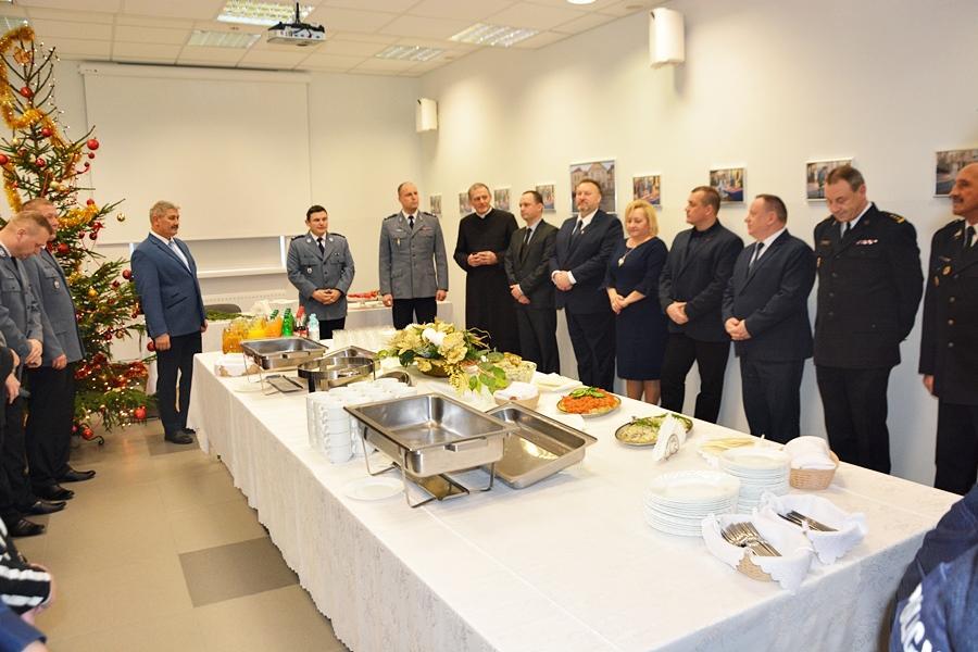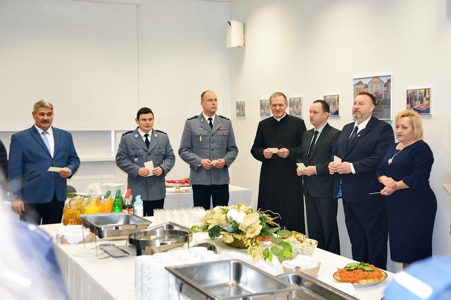 Po wspólnie zaśpiewanych kolędach, uczestnicy uroczystości podzielili się opłatkiem. Życzenia, zdrowia i spokojnej, bezpiecznej służby oraz pomyślności w nadchodzącym roku 2019 złożył wszystkim uczestnikom spotkania Komendant Powiatowy Policji w Wysokiem Mazowieckiem podinsp. Krzysztof Woźniewski. Świąteczną modlitwę odmówił Proboszcz Parafii pw. Świętych Apostołów Piotra i Pawła w Wysokiem Mazowieckiem ksiądz kan. Edward Łapiński.
