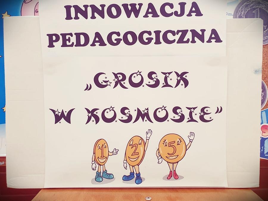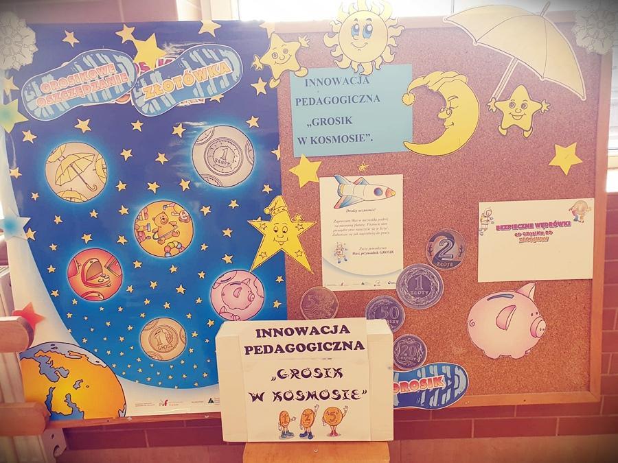 Podczas realizacji innowacji pedagogicznej ,,Grosik w kosmosie”, uczniowie brali udział w ciekawych konkursach plastycznych pod hasłem ,,Wymarzona podróż kosmiczna” , ,,Oszczędzam na marzenia” , ,,Świnka skarbonka”. Byli na wycieczce w Olsztynie, gdzie uczestniczyli w ciekawych zajęciach edukacyjnych pod sztucznym niebem w Planetarium, odwiedzili Centrum Pieniądza NBP w Warszawie, jak również ciekawie spędzili czas na wycieczce do Centrum Kopernika. Odbyło się bardzo ciekawe wspólne spotkanie, gdzie uczniowie ratowali Grosika z rąk złej królowej Negacji i przy okazji zgłębiali tajemnice kosmosu rozwiązując zagadki z ,,kosmicznej szufladki”. Miało miejsce również spotkanie z paniami Agatą Rydzewską i Moniką Wyszyńską przedstawicielkami Banku Spółdzielczego, które przygotowały ciekawą prezentację na temat ,,Historii pieniądza” oraz konkurs ze znajomości wiedzy na dany temat z nagrodami. Uważamy, że cele innowacji pedagogicznej ,,Grosik w kosmosie” zostały w pełni zrealizowane.