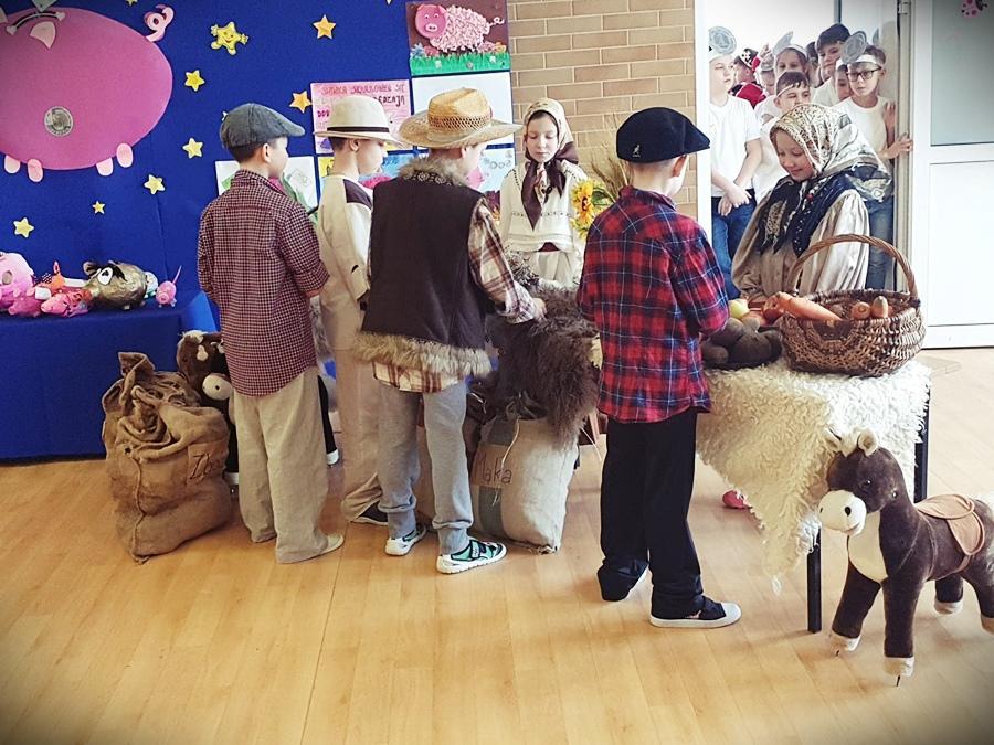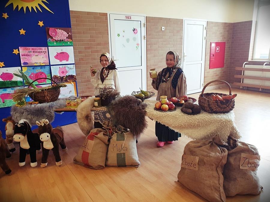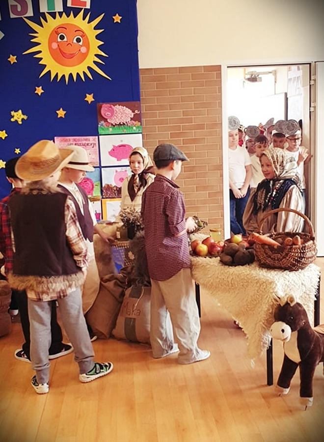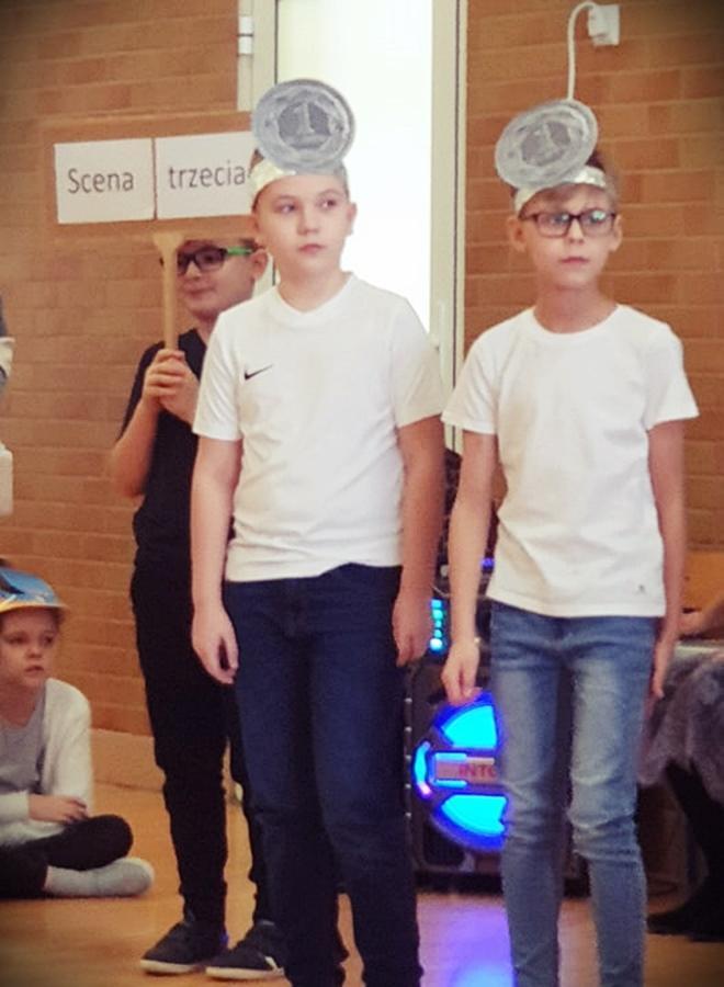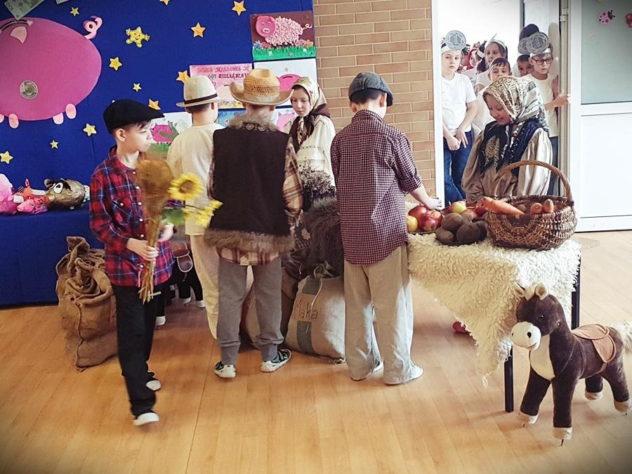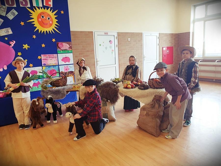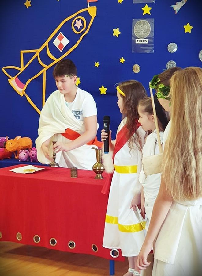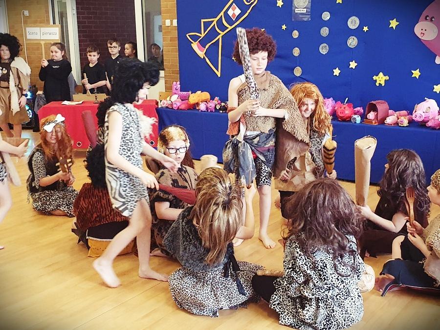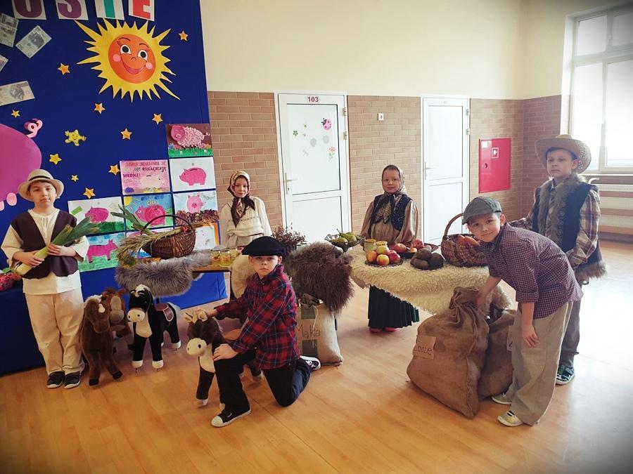 Na spotkaniu uczniowie klas trzecich zaprezentowali przygotowane scenki pod tytułem ,,Historia pieniądza”. Scenkę pierwszą dotyczącą czasów ludzi pierwotnych wymieniających się przedmiotami przygotowali uczniowie klasy III a pod kierunkiem pań Elżbiety Kalinowskiej i Jolanty Kłosek. Scenkę drugą pokazującą dawny targ rolny i rolników wymieniających się towarami przygotowali uczniowie klasy III b pod kierunkiem pani Danuty Sitarskiej. Scenkę trzecią pokazującą czasy jak w Grecji powstała pierwsza moneta przygotowali uczniowie klasy III c pod kierunkiem pani Bożeny Gutowskiej –Popławskiej. Scenka czwarta ukazująca czasy panowania królów w Polsce i bicia ich monet była autorstwa uczniów klasy III d pod kierunkiem pani Joanny Godlewskiej. Scenka piąta to czasy współczesne, gdy mamy nie tylko pieniądze ale i karty kredytowe została przygotowana przez uczniów klasy III e pod kierunkiem pani Marioli Woroszył.
