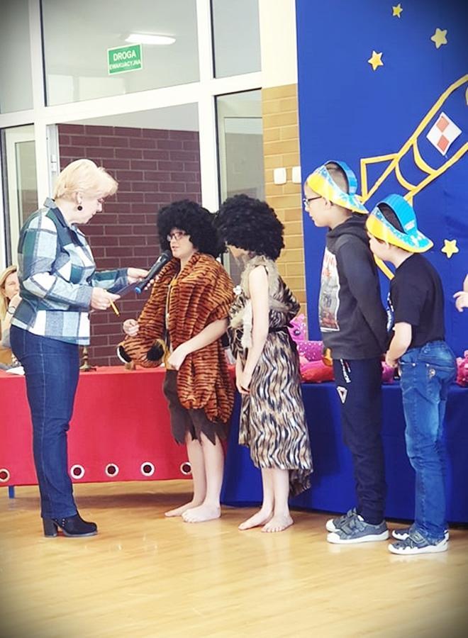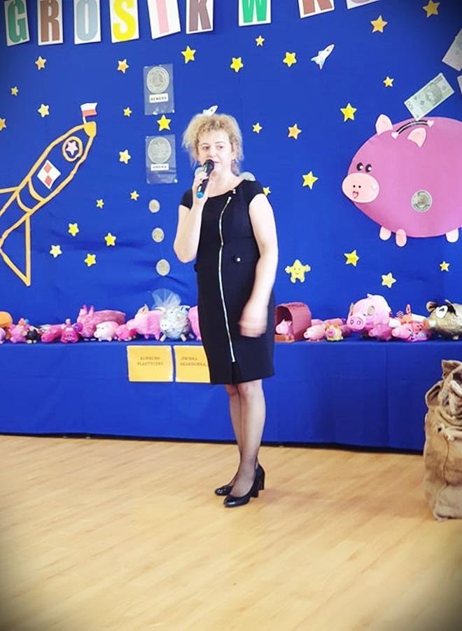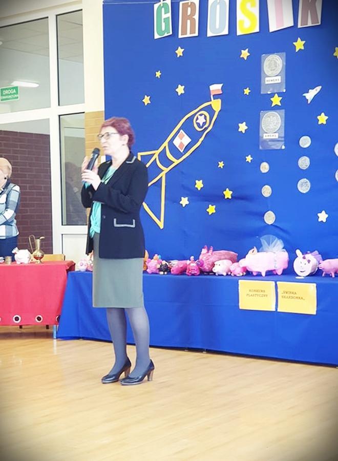 Następnie pani Danuta Sitarska przypomniała cele i zakres innowacji pedagogicznej. Innowacja ,,Grosik w kosmosie” trwała rok - od grudnia 2017 roku do grudnia 2018 roku. W czasie realizacji projektu doskonalone były procesy poznawcze, kształtowane prawidłowe nawyki oraz postawy warunkujące sprawne i odpowiedzialne funkcjonowanie we współczesnym świecie. Wprowadzane były pojęcia związane z edukacją finansową oraz z zakresu bezpieczeństwa. Zdobyte przez uczniów umiejętności wykorzystania nabytej wiedzy, doskonalone były podczas wykonywania zadań, rozwiązywania problemów życia codziennego, w trakcie zabaw i gier dydaktycznych.