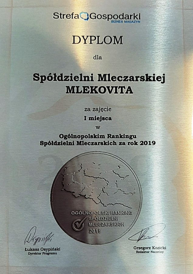 MLEKOVITA zajęła także I miejsce w Ogólnopolskim Rankingu Spółdzielni Mleczarskich za rok 2019, organizowanym przez magazyn „Strefa Gospodarki”, dodatek do „Dziennika Gazety Prawnej”.