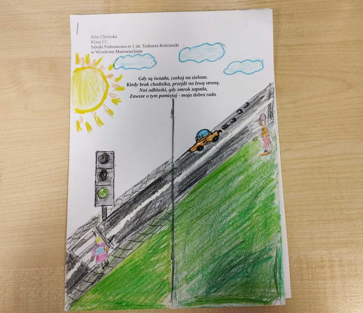 Profilaktycy i mundurowi z wysokomazowieckiej jednostki zorganizowali konkurs na rymowankę "Bezpieczna droga do szkoły”. Współorganizatorem inicjatywy było Starostwo Powiatowe w Wysokiem Mazowieckiem. Konkurs skierowany był do uczniów klas I-III ze szkół podstawowych. Jego głównym założeniem było wykonanie czterowersowej rymowanki związanej z bezpieczeństwem pieszych w ruchu drogowym szczególnie w drodze do i ze szkoły. Na konkurs nadesłano ponad 170 prac. Spośród nich organizatorzy wybrali 3 najlepsze: