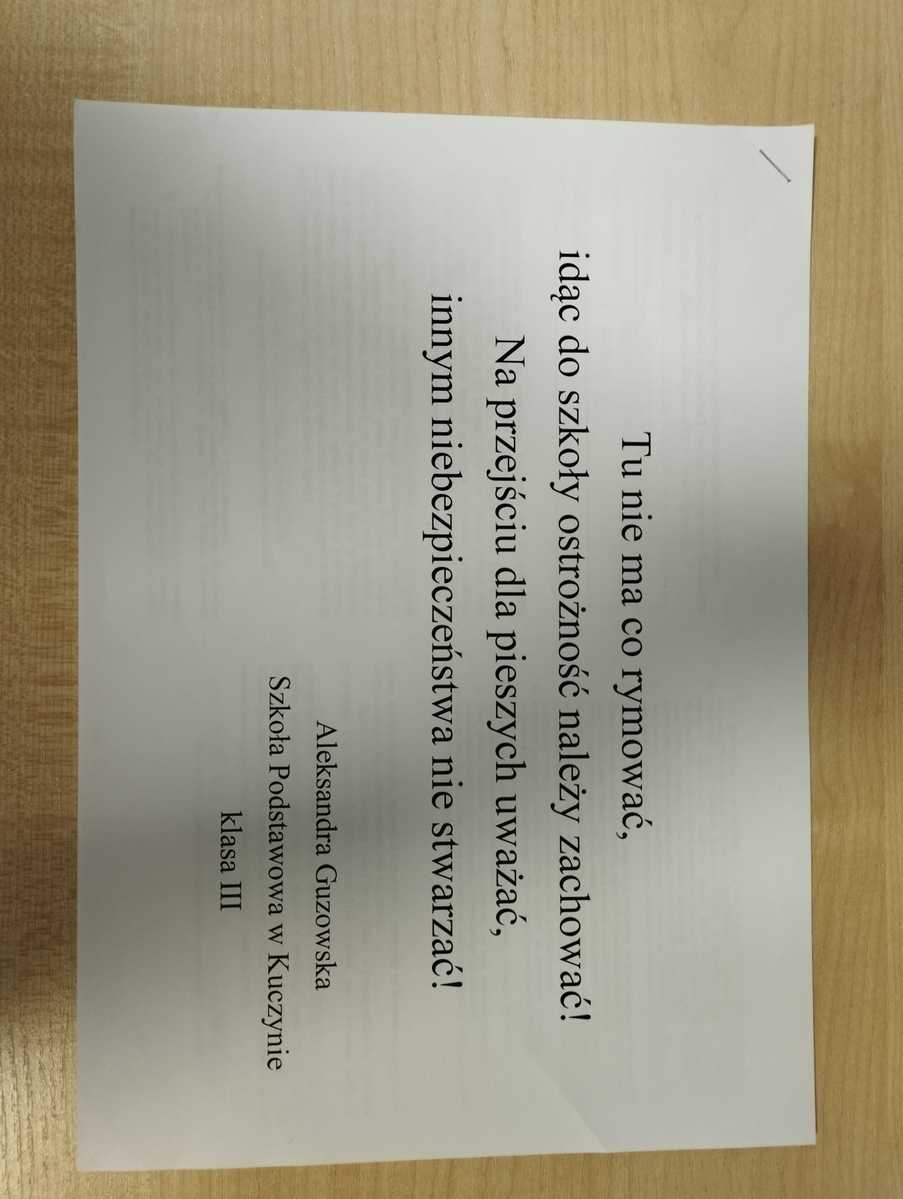 Policyjni profilaktycy, przy współpracy Starostwa Powiatowego w Wysokiem Mazowieckiem, zorganizowali konkurs na rymowankę „Bezpieczna droga do szkoły”. Zadaniem konkursowym było wykonanie czterowersowej rymowanki związanej z bezpieczeństwem pieszych w ruchu drogowym szczególnie w drodze do i ze szkoły. Z ponad 170 prac zostały wybrane te najlepsze. Autorzy zwycięskich prac otrzymali atrakcyjne nagrody.