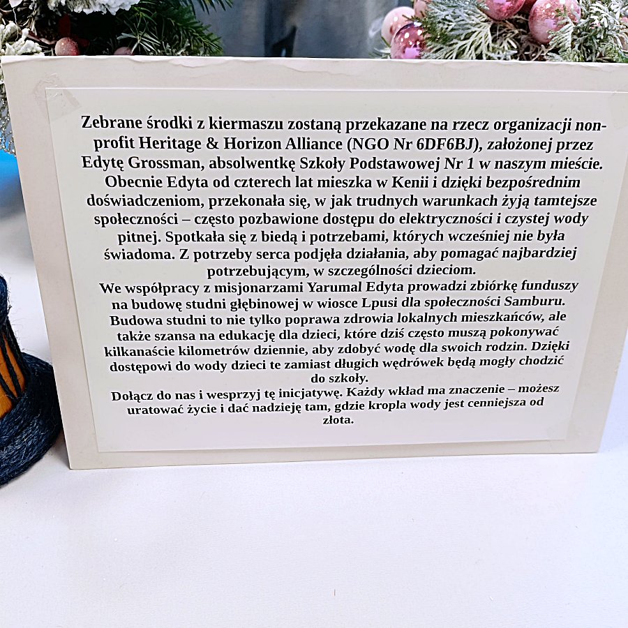 Stroiki i dekoracje świąteczne zostały wykonane przez seniorów z Klubu Senior+ oraz młodzież podczas wspólnych warsztatów kreatywnych. Ozdoby będą dostępne podczas kiermaszu, a zebrane środki zostaną przekazane na rzecz organizacji Heritage & Horizon Alliance (NGO Nr 6DF6BJ). Organizację założyła Edyta Grossman, absolwentka Szkoły Podstawowej Nr 1 w Wysokiem Mazowieckiem, która od czterech lat mieszka w Kenii.