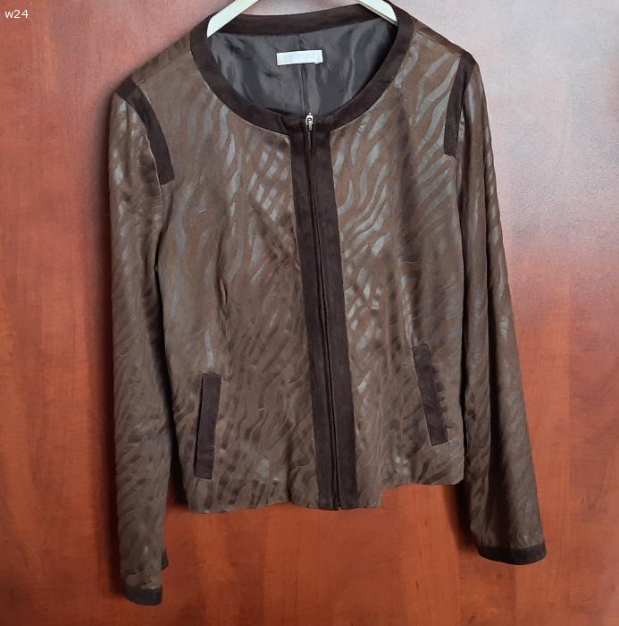 Treść ogłoszenia: Sprzedam: ŻAKIET brązowy zamszowy z oryginalną fakturą, długi rękaw, na dobrej jakości podszewce, zapinany na suwak na całej długości (działa idealnie), leciutko taliowany, 2 kieszenie wewnętrzne. Rozmiar M/L. Długość całkowita ok. 45 cm, długość rękawa 61 cm. Stan bardzo dobry – zdjęcia. Świetny dodatek do każdej stylizacji.
